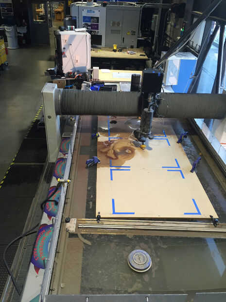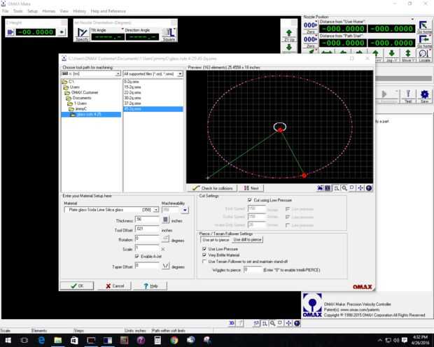 Con un amigo, me había cargado el material en la cama, carga el archivo .omx (con A-jet activado, forma cónica compensación apagado, baja presión, material frágil).