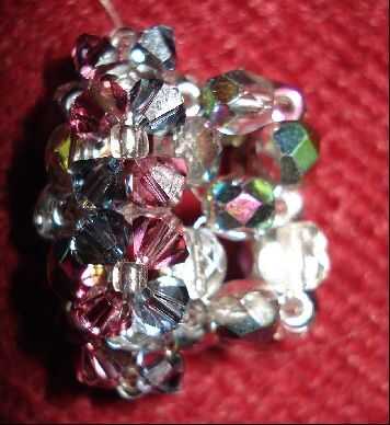2. Comience con 2 agujas con hilo por base perla Checa, a través de ambos. Paso 1: En el hilo desde la parte superior izquierda de la Plaza de añadir 1 grano de Swarovski Crystal en "b" Color más un grano de semilla, añadir 1 más del cristal "b", de roscado del lado izquierdo al lado derecho del primer pequeño cuadrado, pasando por derecha del grano Checa base inferior.