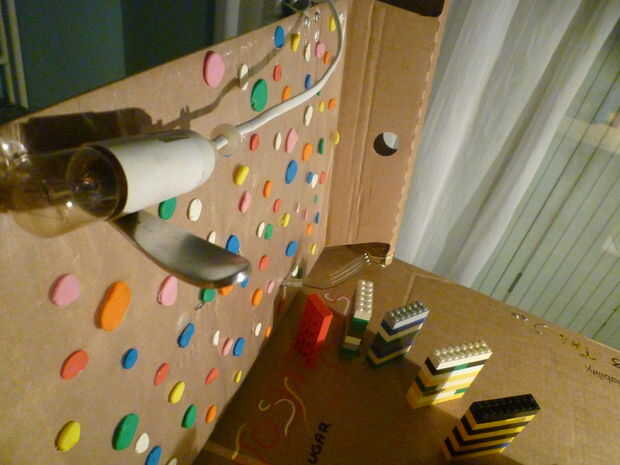 Utilizamos las horquillas en el cartón a mantener el foco en posición de espera y detenerlo cuando está abajo.