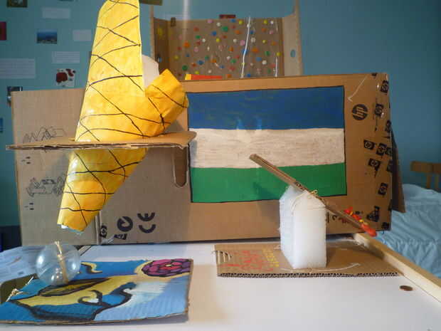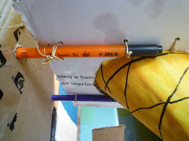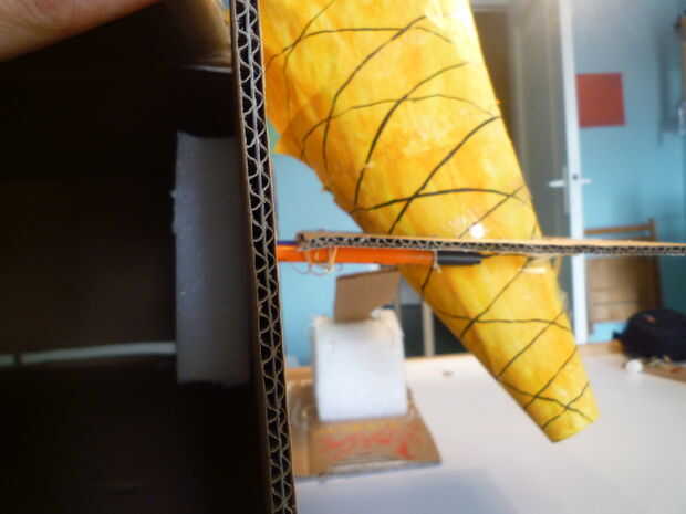 Los agujeros en el cartón vertical y la espuma plástica se pueden hacer fácilmente con un destornillador (hacer agujeros recta). Para fijar la plataforma horizontal en las plumas horizontales, la forma más fácil es hacer dos agujeros en el cartón a cada lado del lápiz y una goma cortada para atar el lápiz a la cartulina.