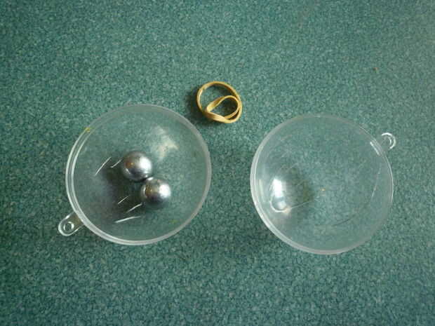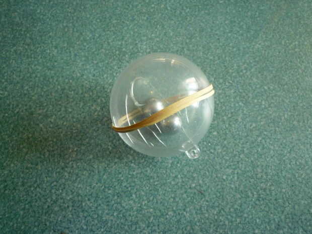 Así que vamos a hacerlos! Pero tenemos que hacer que la bola va hacia abajo de los carriles primero debemos establecer los carriles rectos. Usamos una bola de Navidad de plástico transparente a rodar por los rieles y ponemos dos canicas de acero adentro a pesar abajo (ver fotos). Una vez que sabemos el diámetro de la bola, podemos fijar los rieles.