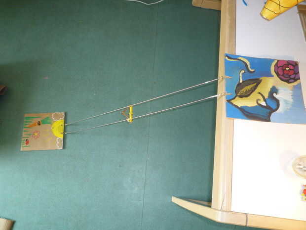 El truco es configurar los rieles para que no se muevan mientras que la bola va hacia abajo. Para esto, hacer dos plataformas de cartón y coloque un trozo de alambre metálico a la plataforma en un extremo y a la barra metálica en el otro extremo. Luego use una goma cortada como hilo conductor para mantener la posición del alambre metálico en la barra.