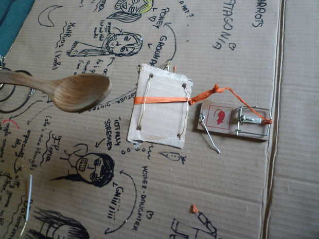 Para implementar que, nos fuimos para la solución de la trampa de rata, por lo que tendrá su catapulta (fijado sobre un soporte), algunos cartulina (otra vez...), alambre, pegamento fuerte, un gran hilo (rafia funciona bien) y una trampa para ratones.