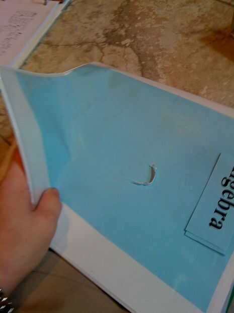 Saque la placa de cartón de los lados y la parte de atrás cortando la parte superior de la carpeta. (ver fotos)