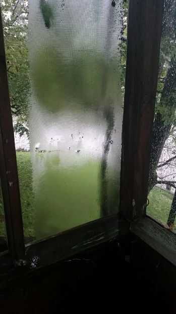 Aquí es otro mío. En nuestro proyectado en cubierta, se instalaron canaletas, pero el techo no se extiende hacia fuera del borde de la pared con un voladizo. Así que, cuando llueve, llene los canales y el agua corre hacia abajo de la pantalla y en el piso de la cubierta.
