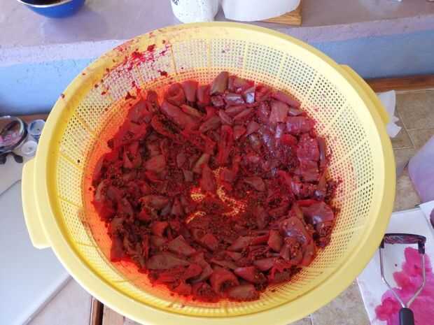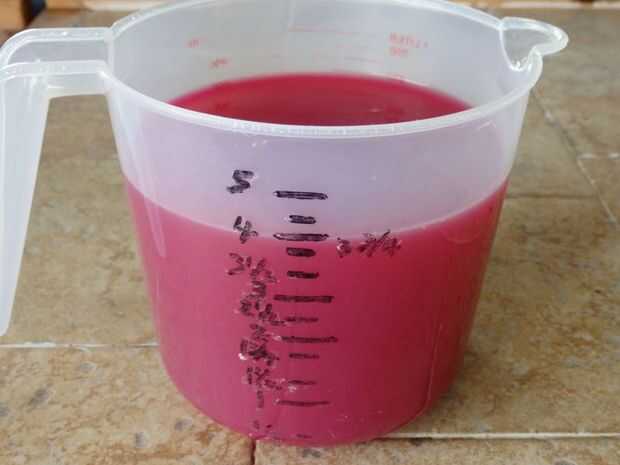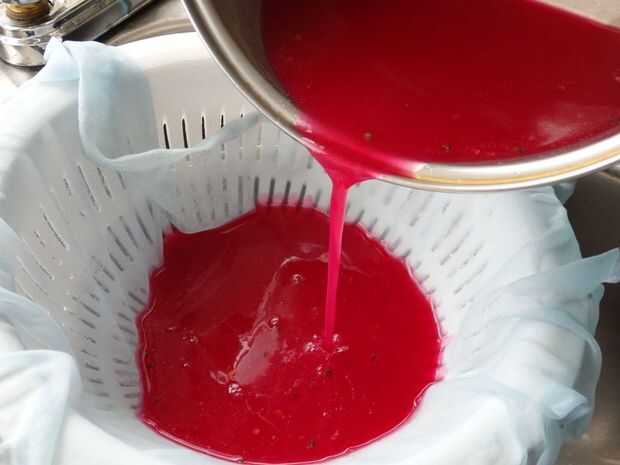 8. Colar el jugo a través de tela de nylon o queso (un poco a la vez, como el paño atasca fácilmente).