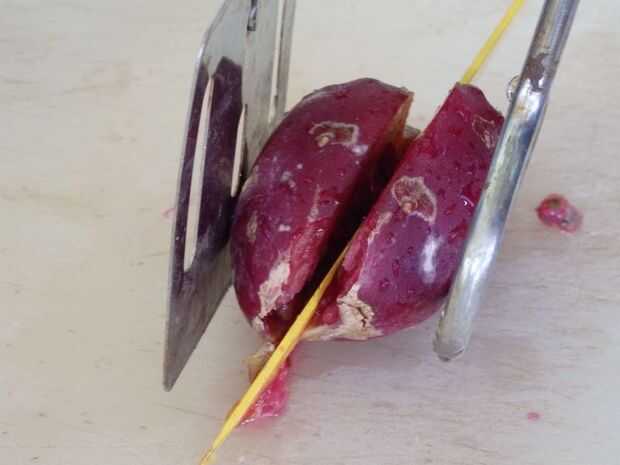 3. Usando las pinzas para sostenerlos, cortar la fruta en cuartos.