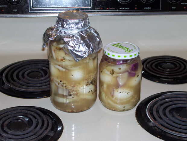 Llene el frasco para cubrir al menos los huevos y la cebolla. Mejor demasiado que no es suficiente.
