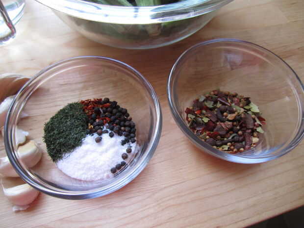 Las partes más importantes de esta receta es una proporción de 2:1 de vinagre y agua, dos cucharadas de sal y tener algún tipo de especia. :)