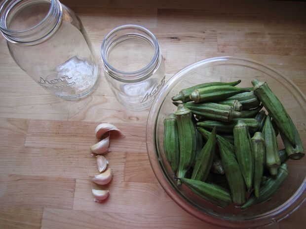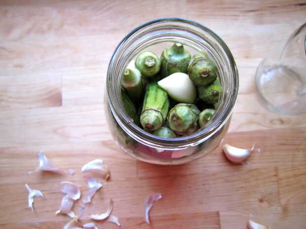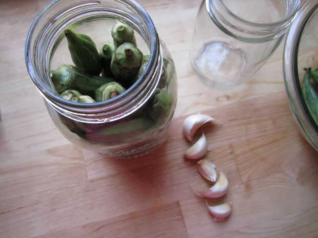 Los frascos con el okra, agregar ajos medida que avanza el paquete. En este caso, la jarra de cerveza de tamaño tiene dos dientes, el cuarto tiene tres.