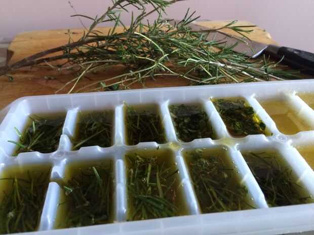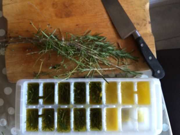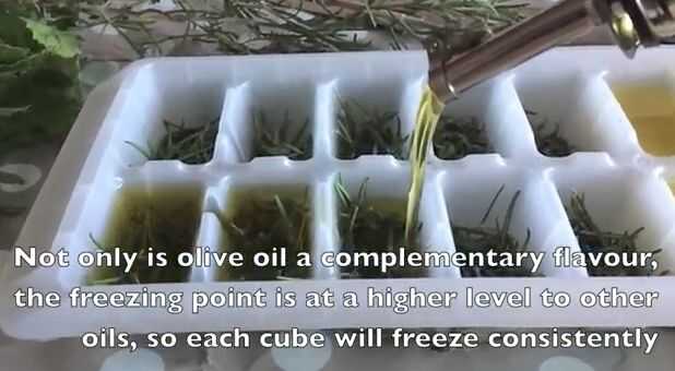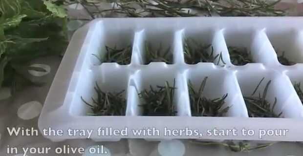 Retire los tallos de las hojas de hierba y colocar en una pila (haga una mezcla de hierbas si desea demasiado), luego llenar cada sostenedor del cubo de hielo por 2/3 de hierbas (pat down) y luego empiezan a llenar con aceite de oliva hasta la bandeja todo es completo, pero no se derrame sobre el borde.