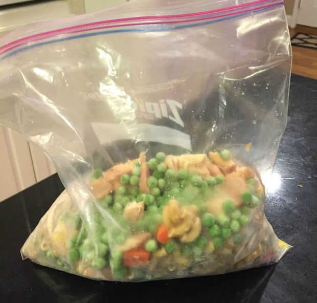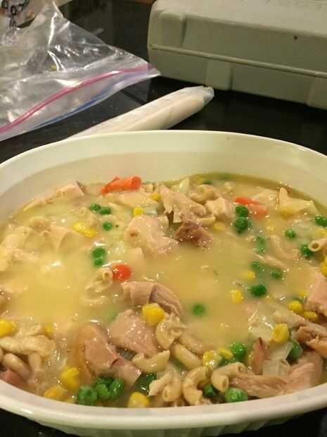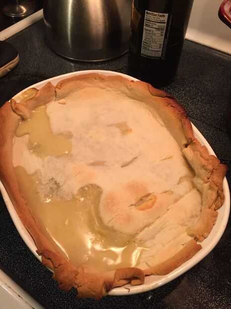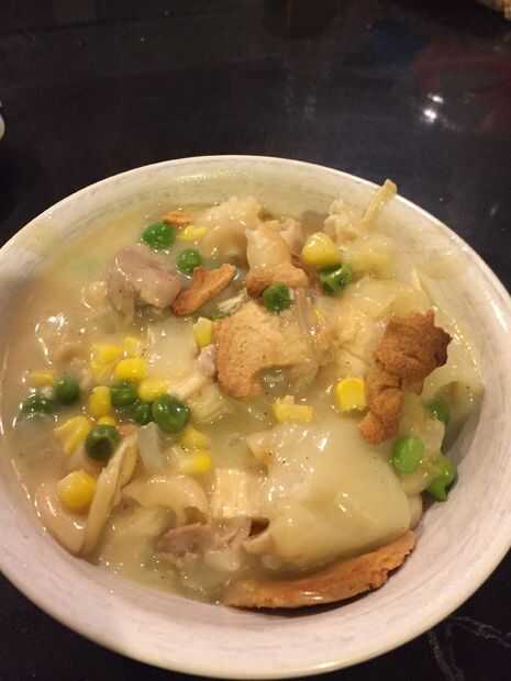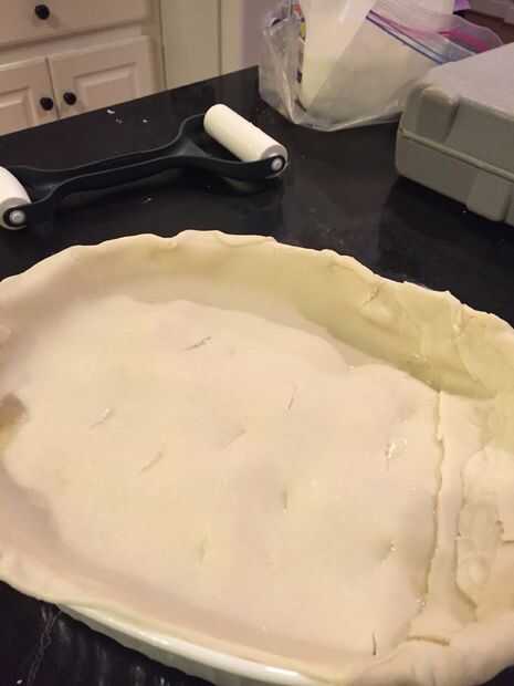 La semana pasada añadí pollo a mi bolso así que estoy listo para hacer un pastel. Se necesita una tarta congelada. Saque y deje que se descongele mientras se están mezclando los demás ingredientes. En las estufa derretir dos cucharadas de mantequilla si hay no hay cebolla en la bolsa saltee la cebolla en la mantequilla antes de agregar la harina. Añadir dos cucharadas de harina y hacer una calle. Ahora agregue la leche y caldo de pollo. Añadir las verduras de "deben ir". Vierta en una cazuela. Poner la tarta descongelada en la parte superior y hornear a 350 grados durante 35-45 minutos. Añadir hoja de lata a los bordes después de 30 minutos para mantener los bordes de la quema.