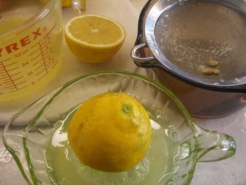 Exprime unos limones para zumo de limón. Colar las semillas hacia fuera.