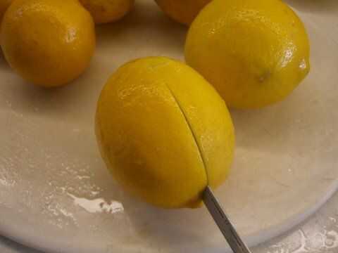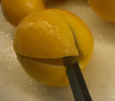 Cortar limones longitudinalmente, pero no totalmente, solo a la parte inferior para que éstos estén fijados.