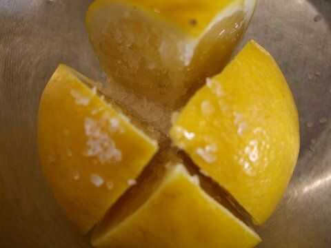 limones el Salar es una tradición de Medio Oriente solía conservar limones sin refrigeración, y el condimento resultante es totalmente comestible, incluyendo la corteza.   Servir con cordero, pollo, pescado, cous cous o pasta; sin embargo, también en