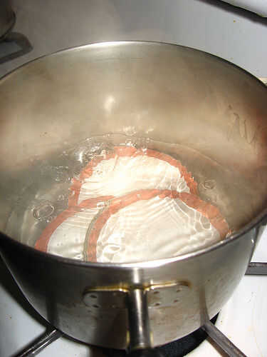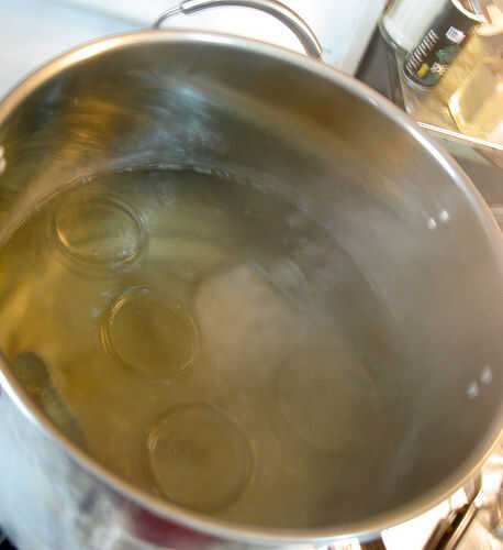 En una cacerola pequeña, esterilizar las tapas en agua hirviendo. Guardo las tapas en el agua hasta que estoy listo para usar.