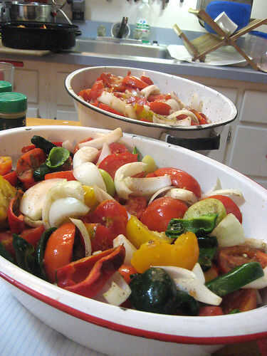 En un asador, mezcle verduras con especias y aceite de oliva.