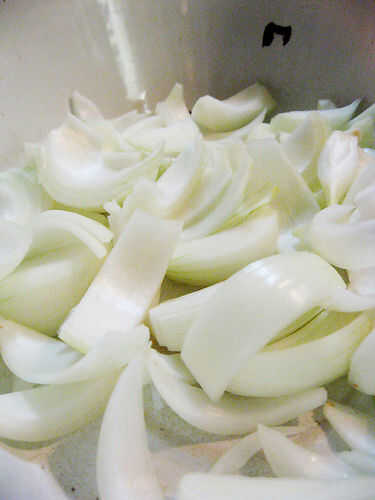 Cebollas: Eliminar extremos, cortar por la mitad y hacer un corte áspero.