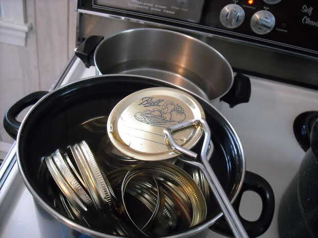 Usando las pinzas quitar una tapa de agua caliente y colocar en la parte superior de la jarra. Agarra un anillo y apriete firmemente.