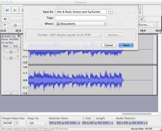 Ahora que hemos registrado nuestra canción, tenemos que hacerlo en un archivo de música que podemos escuchar. Para ello, tenemos que ir a archivo > Exportar Audio. Entonces le pedirá que elija un formato de audio y el nombre. Escriba el nombre de la canción y seleccione el formato de audio que desee.
