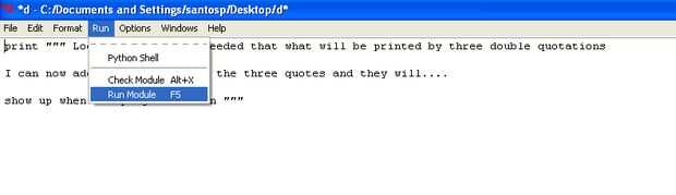 Ahora escriba en el siguiente: Ahora puedo añadir nuevas líneas dentro de las comillas y lo harán... Aparecen cuando se ejecuta el programa "" " Imprimir "go", "perro"!