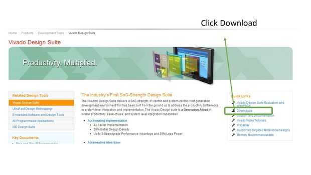 Ir al sitio web de Xilinx http://www.xilinx.com/products/design-tools/vivado/ y haga clic en descargas en el lado izquierdo de la Página Web.
