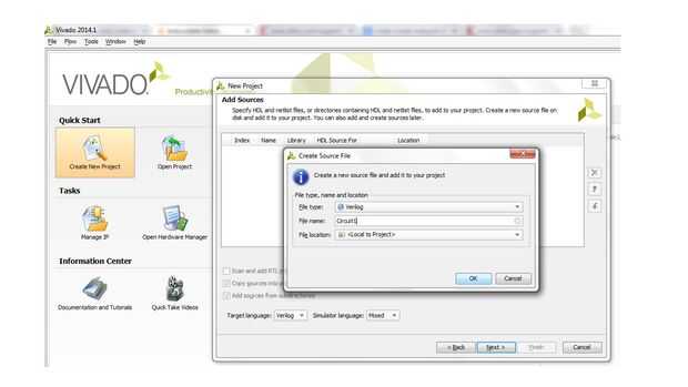 Haga clic en "Crear archivo". Entonces, es "Crear el archivo de origen" pop-up. Elija Verilog en tipo de archivo. Nombre del archivo "Circuit1" y elegir la ubicación del archivo < ubicación proyecto >. Haga clic en aceptar--> siguiente--> siguiente. A continuación, debe elegir la parte. Digilent SDMONexys 4 se basa en XC7A100T-1CSG324C. Por lo tanto, nosotros debemos elegir familia: Artix 7 y paquete:CG324, grado de la velocidad: -3. Destacar el XC7A100T1CSG324-3 (última opción) y haga clic en siguiente--> finalizar.