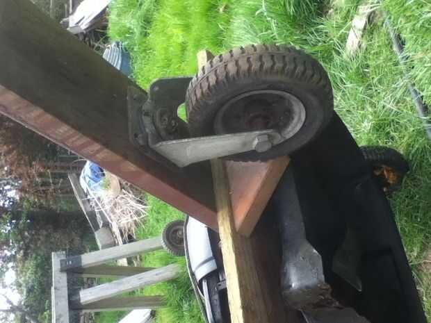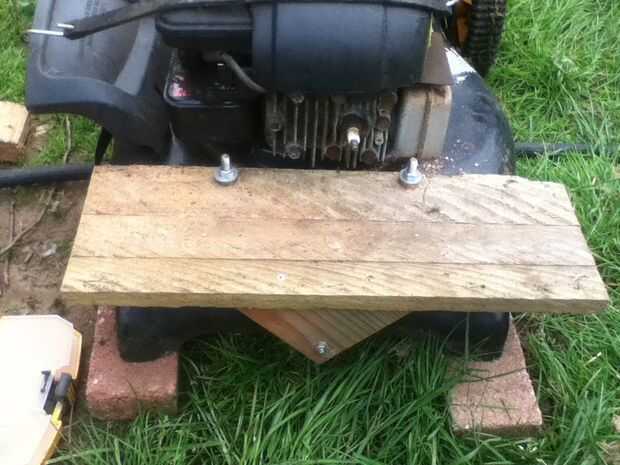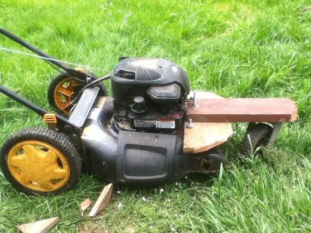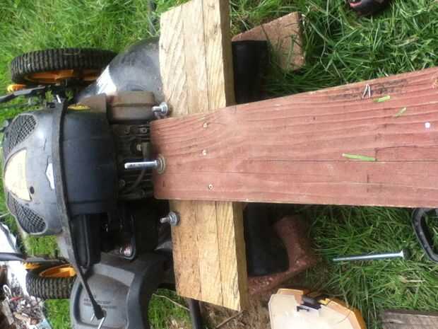 Desconectar el cable de bujía!!!!!! Taladre los orificios para los tornillos, me encontré con los pernos de carruaje. Enrosque las tuercas sobre podadora no abajo en el tubo de lámina! Podría dañar la lámina. Montar la rueda de nuevo y cortar la madera. Permite cortar!
