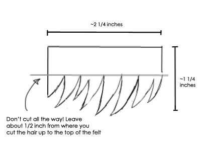 Pelo: con fieltro amarillo, corte un pedazo aproximadamente 2 1/4 "x 1 1/4" (la longitud variará dependiendo de cómo su cabeza resulta... cortar por mucho crees que tendrás que darle un buen conjunto de explosiones). Con esta pieza de fieltro, cortar un flequillo barrido lateral agradable para pelo de Link (creo que Justin Bieber!), pero no corte hasta la parte superior, dejando aproximadamente 1/2 pulgada desde la parte superior donde te cortas el pelo (ver diagrama). Recortar dos triángulos rectangulares pequeños más para hacer sus patillas.