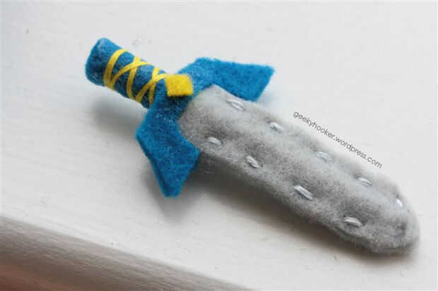 Corte un pedazo de la punta de un palillo desechable 2.5" de largo. Con fieltro gris, corte dos piezas de una "cuchilla" para cubrir el palillo y dejar 1/2 de la parte superior del palillo expuesto para la manija de la espada. Antes de coser la "cuchilla" en el palillo, aplicar pegamento a las dos piezas antes de colocarlas sobre el palillo, luego coser a lo largo de los lados y alrededor de la punta de la hoja. Un trozo pequeño de fieltro azul en el área de la manija y pegamento abajo. Utilice un hilo de bordar amarillo para envolver alrededor de la empuñadura en un diseño entrecruzado. Esto le dará a la manija un agradable efecto decorativo, y también llevará a cabo el fieltro abajo mejor así. Ate el hilo amarillo y ocultar las colas en la hoja de la espada. Usando fieltro azul, corte dos piezas idénticas para formar la empuñadura de la espada de Link. Asegúrese de que las piezas son lo suficientemente amplia como para cubrir donde comienza la hoja y el mango se detiene para hacer la espada vea más general (también para ocultar el nudo atado para el hilo amarillo decorativo, si es aparece!). He añadido un pequeño diamante amarillo pequeño en medio de la empuñadura, pero usted puede adornar la espada sin embargo te gusta! :)