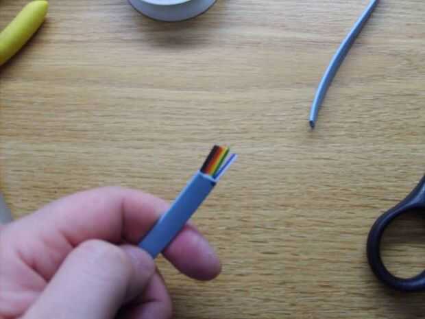 Vamos a utilizar la sección del cable que aún tiene el adaptador de 9 pines. Tome el extremo de ese cable y los cables cerca de la mitad de la pulgada abajo de la tira.