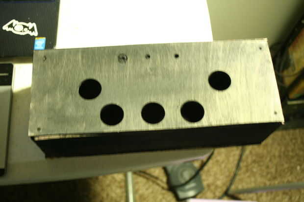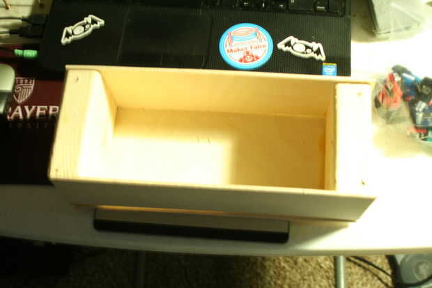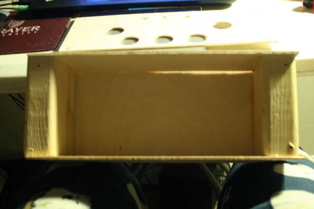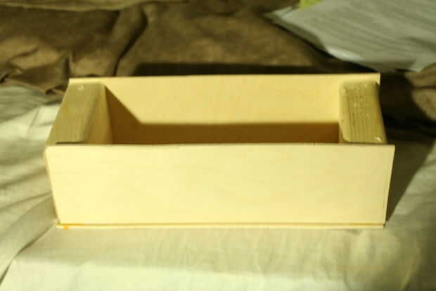 Fui a una tienda de máquina y una caja de 13 x 5 de madera de moda. He utilizado trozos de madera como un marco de apoyo. Apoyar la parte superior. Cercó la tapa interior con piezas de espiga. Pintaba negro para un toque de madera teñido.