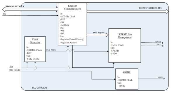 Este bloque está diseñado para el envío de datos de configuración para la pantalla LCD. En una cuestión de hecho, el LCD está conectado al chip NOVATEK NT39016 que utiliza el interfaz de puerto Serial (SPI) de 3 cables para toda la configuración de los parámetros internos.