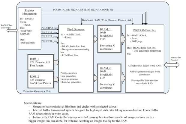 La unidad primitiva de generador (PGU) es un bloque que hemos diseñado para dar a nuestra tarjeta gráfica la capacidad para generar un conjunto de píxeles formando ya sea una línea, un círculo o una letra del alfabeto y mostrar en la pantalla LCD. También puede establecer el color de un píxel para permitir que el MCU hacer más complejo pritimive generación (no acelerado).