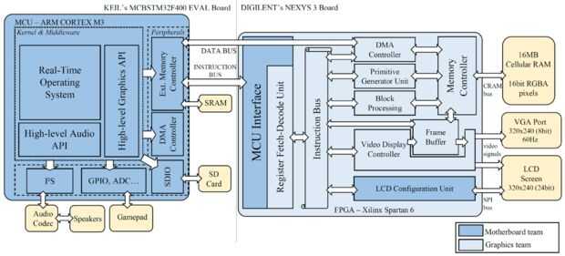 Para resumir los roles de los diferentes módulos, la Interfaz MCU (equipo MCU) permite el STM32 escribir en los registros de varios módulos, a través de un solo maestro, múltiples esclavos Bus de instrucciones, los datos escritos pueden configurar diferentes aspectos de la GPU o lanzar una operación de procesamiento de imágenes. Entre los módulos tenemos Regulador de exhibición de Video, que proporciona las señales de sincronización adecuado para la salida de VGA o LCD, y el Frame Buffer también se sincronizará a este módulo.