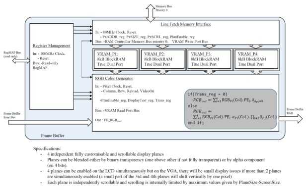 Aparte de esta función principal de buffering, este módulo puede utilizarse también para crear varios planos de la pantalla y mezcla con una estrategia de transparencia adecuada. De hecho, ya que el frame buffer debe ir a buscar una línea en el tamaño del formato de presentación, la dirección traer se puede jugar con para proporcionar aceleración en funciones como desplazamiento. El siguiente componente es el resultado de nuestro diseño.