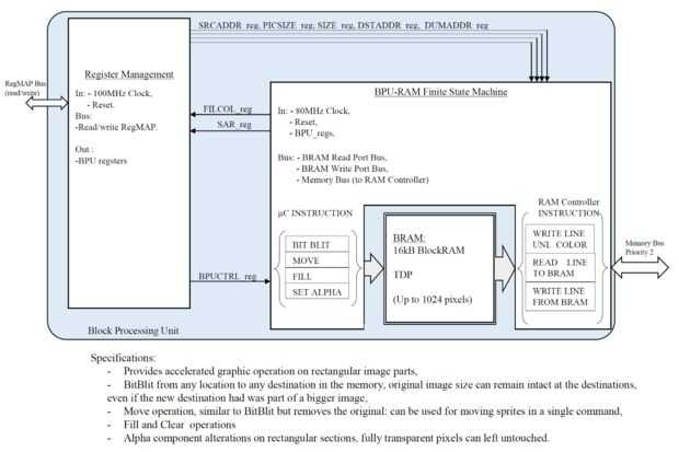 El módulo de la unidad de proceso de bloque es una módulo diseñado para ser usado en bloques rectangulares de imágenes de tratamiento de la imagen. Se beneficia del acceso de memoria de descarga para el espolón proporcionado por el controlador de la RAM, que es grande para trabajar en líneas horizontales debido a su alta velocidad. Por lo tanto es también utilizables zonas rectangulares: el bus de la memoria permite una selección fácil de una zona utilizando HLEN y VLEN PICLEN, es por eso que proveer operaciones especiales aceleradas en ellos es una característica ventajosa. Por lo tanto el nombre de "bloque" unidad de procesamiento.