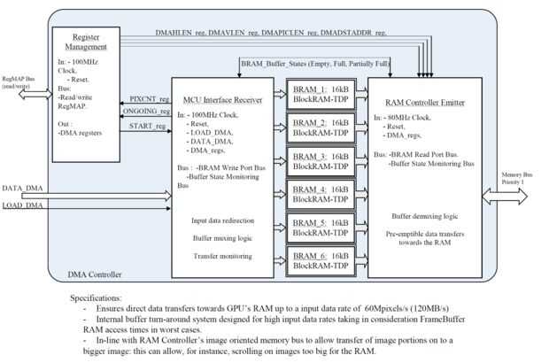 Además de módulo de gestión de registro, este controlador se puede separar en dos submódulos; el receptor de interfaz MCU que se encarga de supervisar estado de la transferencia y almacenamiento en búfer los datos de entrada si hay una constante transferencia DMA. El almacenamiento en búfer se realiza gracias a un total de seis 16 kB BlockRAMs, y estos tampones se reagrupan en un autobús de la única dirección en el lado del puerto de la escritura. El segundo submódulo de este controlador es el emisor de controlador de memoria RAM, este módulo se encarga de "vaciar" estas reservas escribiendo al RAM cuando están llenos de datos suficientes.