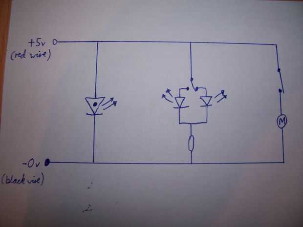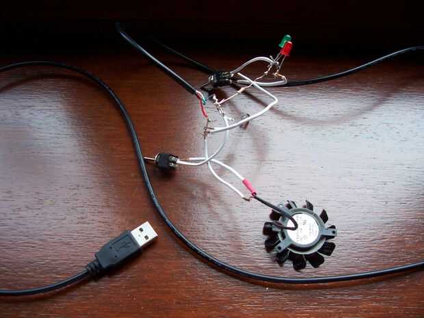 Puertos USB 2.0 (la versión más común) de salida 5v DC en hasta 500mah. Como te quedas por debajo del límite de 500mah, puede tener tanto cosas como usted quiere correr de él! El diagrama del circuito se explica en las fotos así que no entraré en eso aquí. Te voy a decir, no utiliza una ventilador de la CPU como el flujo de aire es dirigida hacia el exterior en vez de remite (o por lo menos estaba en la mía). Aún así, tiene un efecto de enfriamiento. Una palabra de advertencia. Si usted está utilizando un pequeño motor con aspas del ventilador separado Asegúrese de que está clasificada en 5v o tienes las resistencias correctas como la mayoría de pequeños motores 3v.