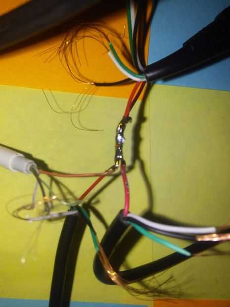 Envuelva las partes expuestas de los cables del mismo color juntos y soldarlos juntos. Sólo tienes que hacer esto para los cables de corriente y tierra, pero lo hice con todos ellos porque me sentía como él.