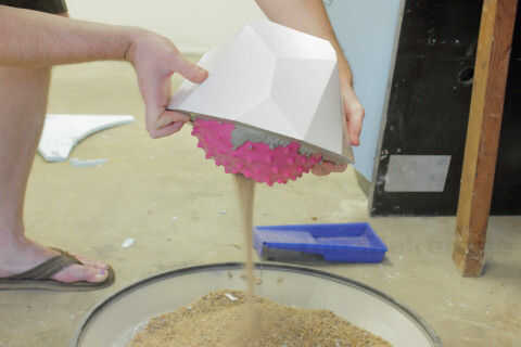 Cuando el concreto haya curado, derramar la arena. La bola debe colapsar y pelar hacia fuera fácilmente una vez que se vacía. El molde externo duro puede ser más difícil; soplar aire comprimido en el borde a veces funciona. Usted también puede tratar de golpear ligeramente, vibración, temblor y curiosos, pero no agrietarse el hormigón!