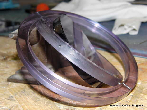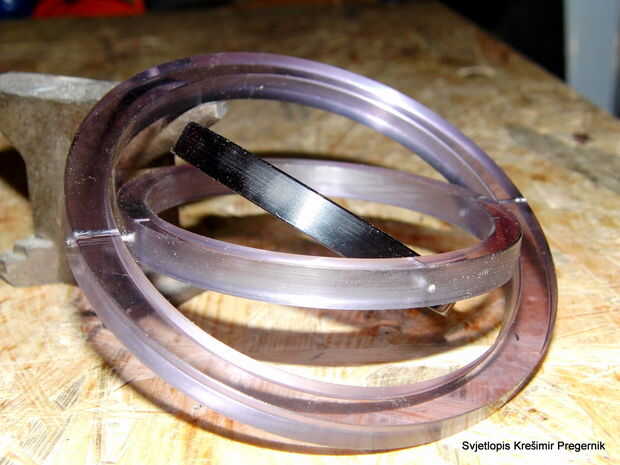 Después de primer anillo se corta, el mismo procedimiento es para el segundo anillo. Perforaciones dos de 1,5 mm que son rectangulares para los primeros agujeros, unos 20 mm de profundidad, el espesor medio de material y luego se cortan al segundo anillo hacia fuera. Inserte un metal acero cambios y tratar de ver los movimientos. Entonces encontrar un 4 arandelas pequeñas como distancias entre los anillos y volver a montar otra vez. Gota aceite también ayuda. Ahora usted tiene giroscopio-gadget. Para los otros piden gravedad.
