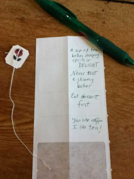 1) quitar cadenas de bolsita de té de bolsitas de té existentes para sus Proverbios. 2) escribir Proverbios en llanura de etiquetas de dirección pegajosa arrugadas en el medio 3) pegue sus Proverbios sobre la vieja etiqueta de bolsa de té