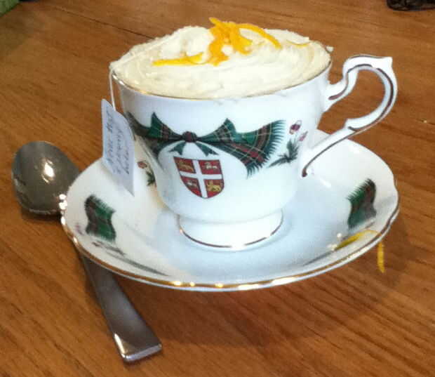 Helada de sus magdalenas y añadir el proverbio del bolso de té. He probado dos maneras diferentes: dejar parte de la torta que muestra para que el glaseado se parece a una porción de crema en una taza de té, o cubrir el todo cupcake con frosting para que se vea como una taza de té con topping de crema espumosa. Decorar con ralladura de naranja un poco.
