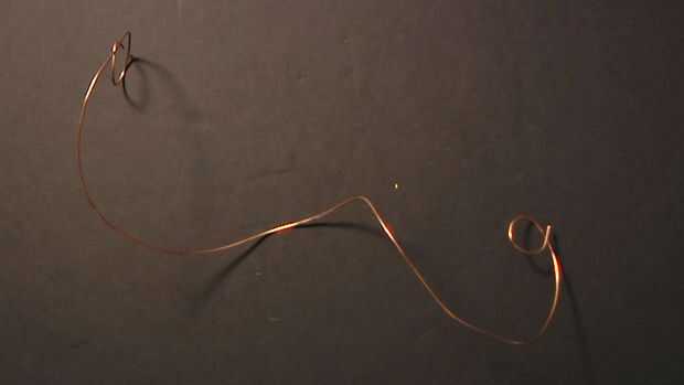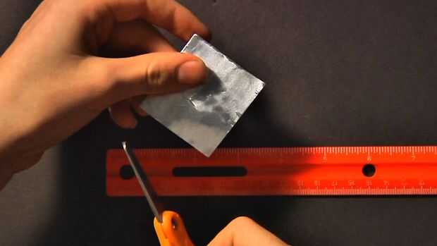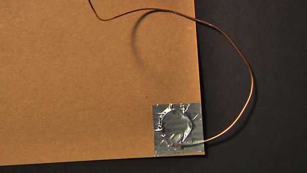 Usando los dedos o las pinzas, hacer un lazo de aproximadamente 1½ pulgadas en ambos extremos de los cables de cobre desnudo. Corte otro pedazo de 2 pulgadas de cinta de aluminio. Desprenda la parte de atrás y usar la cinta de aluminio al palo uno de los lazos en una de las otras piezas de cinta de aluminio.