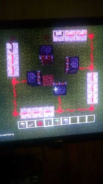 Ahora, construimos los caminos. Cada pistón recibe 5 Redstone y 3 repetidores de Redstone. A partir de un pistón, coloque Redstone en el patrón en la foto, todos los que realmente importa es los repetidores se colocan 3 en una fila y un conjunto en el ajuste más lento (extensión completamente aparte) para cada pistón, y hay un circuito completo alrededor de todo el camino.