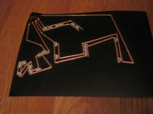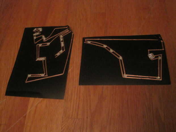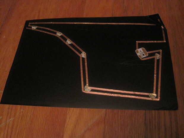 Colocar cada pegatina LED a la cinta conductora. Presione firmemente las pegatinas al papel asegurar buen contacto entre la cinta conductora y los conductores de cobre en las etiquetas de LED.