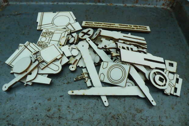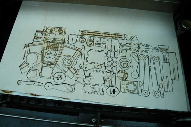 Puedes empezar por descargar el archivo SVG o DXF de Thingiverse, o usted puede utilizar el archivo ECP que hice para mi propio cortador del laser (en este paso). La única diferencia entre archivos de Billy y mi propia es que establecer el orden de la corte a abandonar primero los restos y ha añadido una pequeña placa con el modelo terminado.