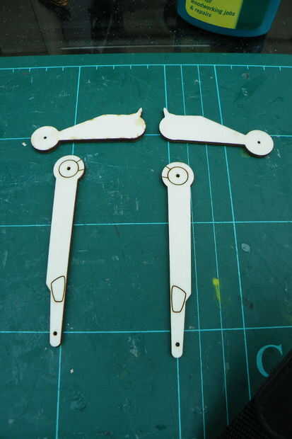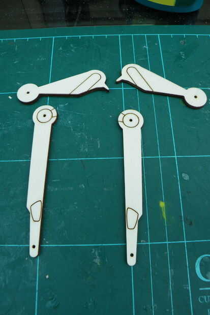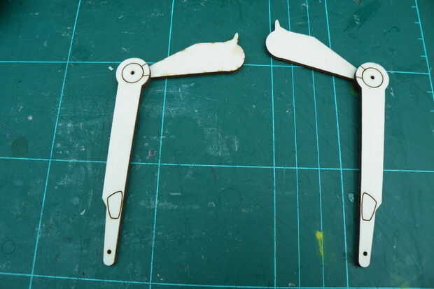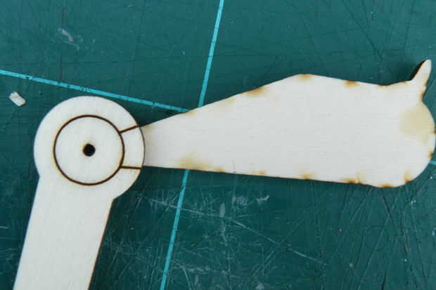 Voltee las piezas en forma de pájaro, entonces la parte más larga en la parte superior de la parte circular del pegamento - hay dos líneas grabadas a hasta.