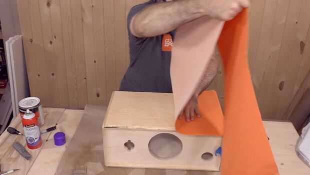 Para colocar el tolex al gabinete sólo te cepillo algún cemento de contacto en la madera contrachapada. Usted puede dejarlo secar durante 10 minutos o puede utilizar una pistola de calor para acelerar. Una vez que se pone pegajoso yo añadir una segunda capa y una vez más usar una pistola de calor para acelerar el proceso de secado. Entonces, usaremos un adhesivo en aerosol en la parte posterior del tolex. Esto genera casi un vínculo instantáneo fijarle al gabinete. No te preocupes aunque el vínculo aún no es demasiado fuerte y permite tirar de él apagado y cambiarlo si es necesario.